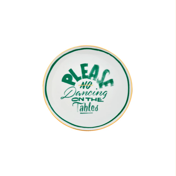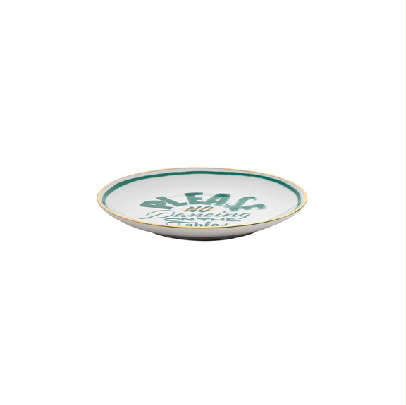 Breng humor en karakter naar je tafel met dit porseleinen bordje met de speelse tekst “Please No Dancing on the Tables”. Het frisse witte design met groene opdruk en subtiele gele rand maakt dit bordje ideaal voor een gezellige aperitivo-sfeer of om kleine hapjes en borrelgerechtjes stijlvol te serveren.