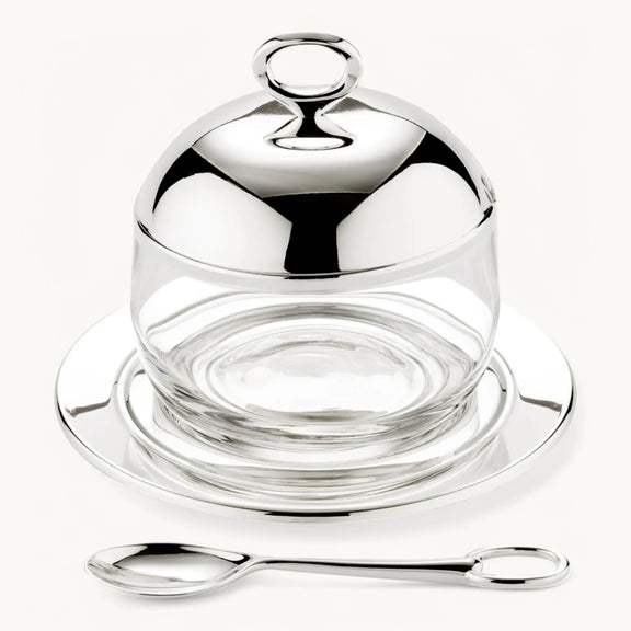 Stijlvolle confituurpot van kristalglas met edel verzilverde afwerking, inclusief bijpassende onderzetter en lepel. Bewaart aroma en smaak optimaal en staat elegant op elke tafel.