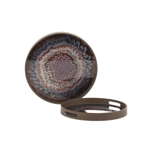 Deze set van 2 stijlvolle dienbladen combineert functionaliteit met een uniek design. De dienbladen hebben een opvallend, organisch patroon in rijke tinten van bruin, paars en blauw, wat zorgt voor een elegante en moderne uitstraling. Dankzij de stevige opstaande rand zijn ze niet alleen decoratief, maar ook praktisch in gebruik voor het serveren van drankjes of hapjes.