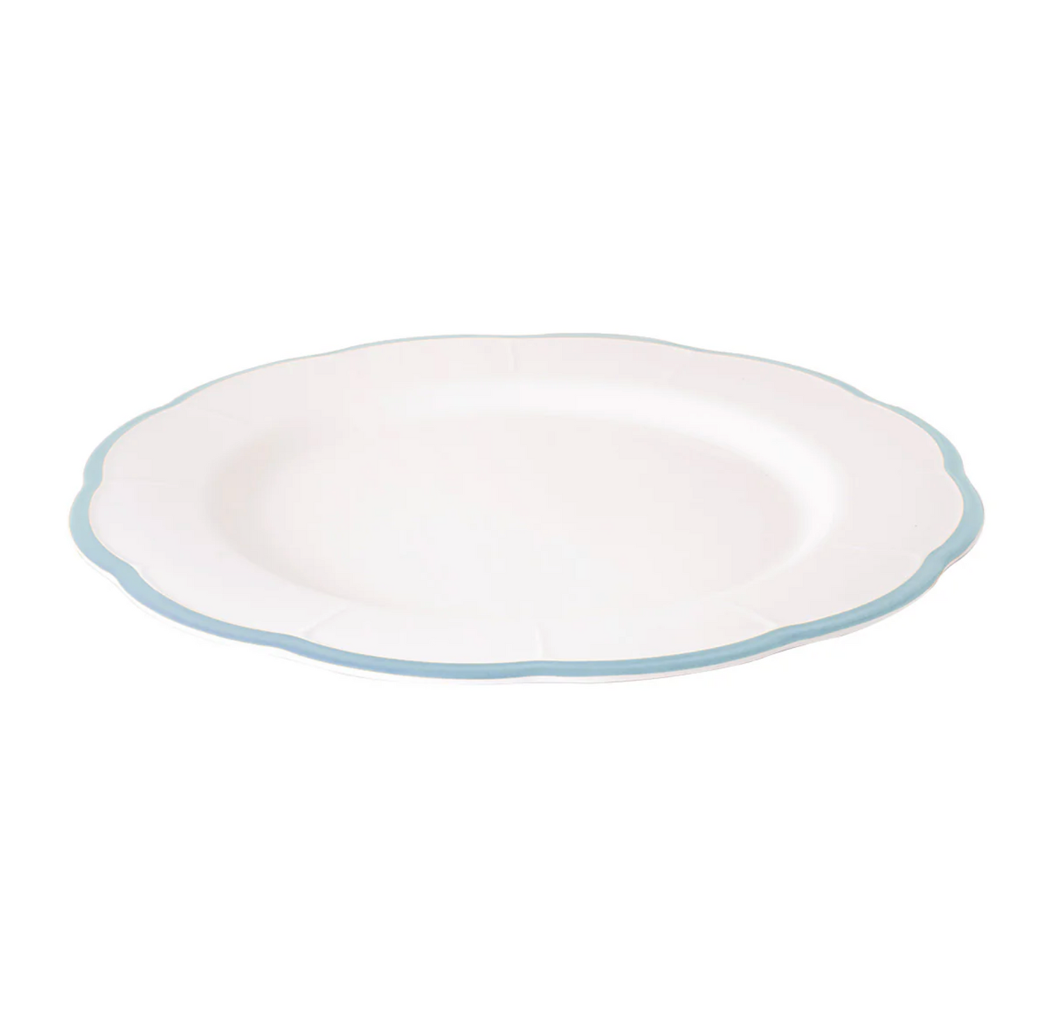 Een elegant dinerbord dat kleur en verfijning samenbrengt. Het contrasterende witte oppervlak wordt omlijst door een speelse, lichtblauwe geschulpte rand, wat zorgt voor een subtiel en charmant accent op je tafel. Gemaakt van duurzaam ironstone, is dit bord zowel functioneel als esthetisch aantrekkelijk.