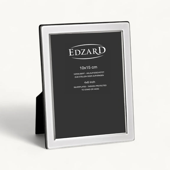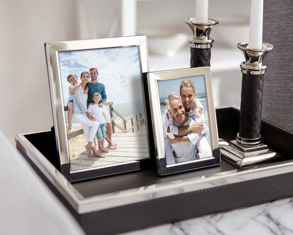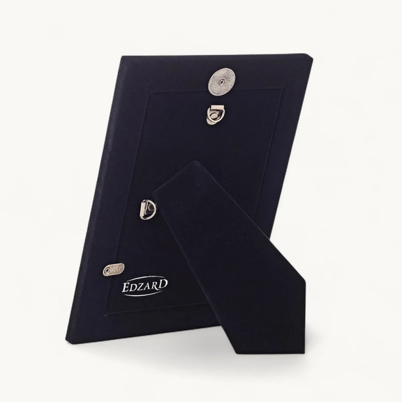 Elegante fotolijst met edel verzilverde afwerking en aanslagbescherming. Voorzien van een luxe zwarte fluwelen achterzijde en geschikt voor zowel staand als liggend gebruik. Kan neergezet of opgehangen worden.