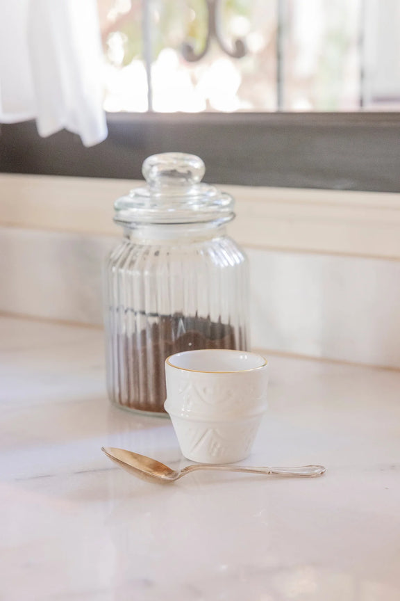 Klein maar verfijnd: dit handgemaakte koffiekopje is perfect voor een intense espresso of een zachte koffie. De 12-karaats gouden details geven het een elegante, luxueuze uitstraling – geïnspireerd op Marokkaanse traditie.