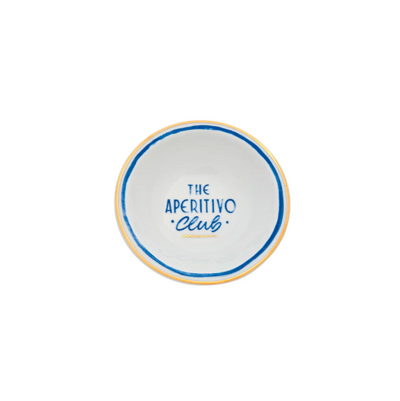 Maak je tafel compleet met dit speelse porseleinen kommetje met de opdruk “The Aperitivo Club”. Het ontwerp in wit porselein met blauwe en gele accenten straalt mediterrane gezelligheid uit en is ideaal om kleine hapjes, nootjes, olijven of dips in te serveren.