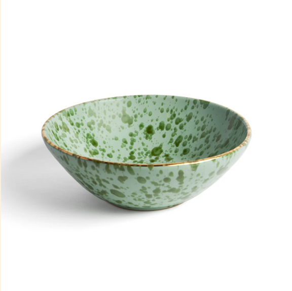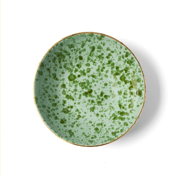 Deze handbeschilderde porseleinen kom combineert verfijning met een speels design. Het groene gespikkelde patroon geeft een levendig karakter, terwijl de elegante gouden rand zorgt voor een luxueuze afwerking. Elke kom is uniek door de handgemaakte afwerking en brengt een stijlvolle en artistieke touch naar je tafel.