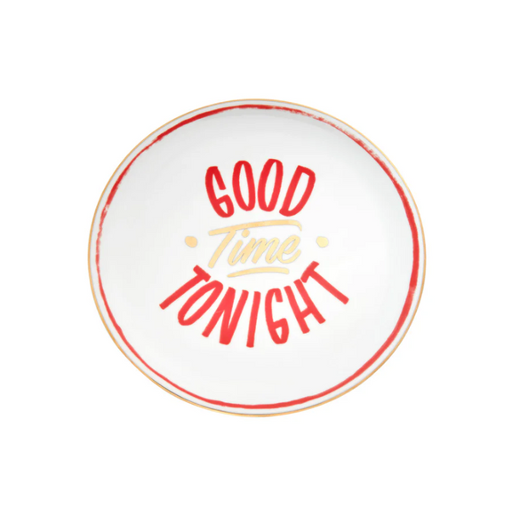 Maak elke pizzanight extra feestelijk met dit porseleinen pizzabord voorzien van de speelse tekst “Good Time Tonight”. Het frisse witte bord is afgewerkt met een rode en gouden opdruk en een contrasterende rand, wat zorgt voor een vrolijke en uitnodigende uitstraling aan tafel.