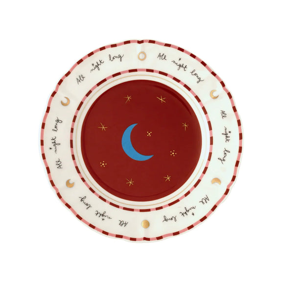 Breng een vleugje magie naar je tafel met dit unieke porseleinen bord uit Italië. In het midden schijnt een maan , omringd door de handgeschreven tekst "all night long" en subtiele gouden accenten. De golvende rand, met zijn grafisch blauw-roze patroon, geeft het bord een speelse, bijna sprookjesachtige uitstraling.