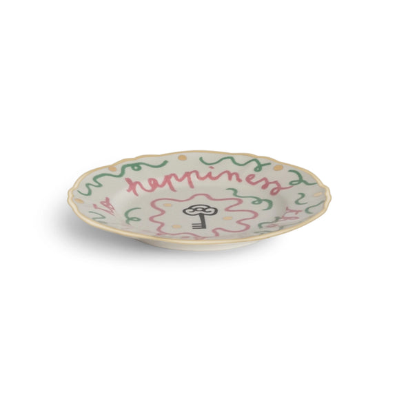 Breng een vleugje magie naar je tafel met dit unieke porseleinen bordje uit Italië. In het midden staat een sleutel, omringd door de handgeschreven tekst “the key to happiness” en subtiele gouden accenten. De golvende rand, met zijn grafisch blauw-roze patroon, geeft het bord een speelse, bijna sprookjesachtige uitstraling.
