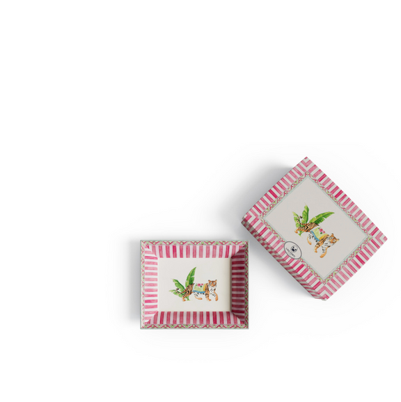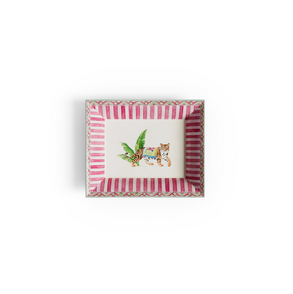 Het design wordt gekenmerkt door zachte aquareltinten, rustende tijgers en miniatuurlandschappen, omlijst door de kenmerkende, gestreepte randen. Zo ontstaat een betoverende, verhaalachtige tafelaankleding die sfeer en elegantie toevoegt.