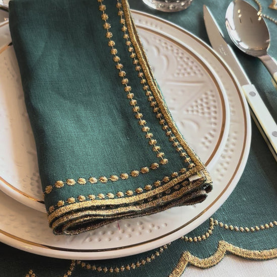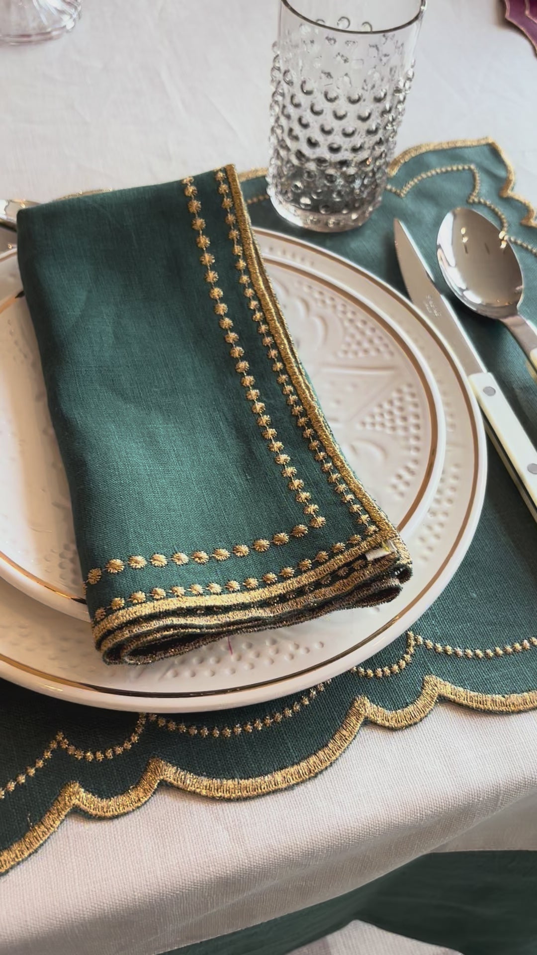 Een elegante servet van puur gewassen linnen, afgewerkt met een verfijnde contrasterende gouden bies. Handgemaakt in Italië. Deze servetten zijn een onmisbaar detail voor een stijlvolle en kleurrijke tafelopmaak en laten zich eindeloos combineren met tafelkleden en placemats uit dezelfde collectie.