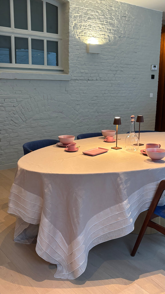 We creëren samen een tafellaken dat helemaal van u is: met liefde vervaardigd in Italië uit hoogwaardig linnen of katoen, desgewenst voorzien van een onzichtbare vlekwerende bescherming.