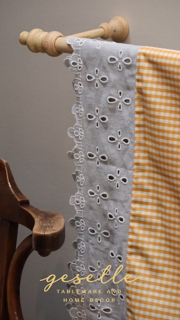 Kies uw afwerking — een verfijnde zoom, een romantische rucherand of een sierlijke bies — en laat uw tafel spreken in de taal van elegantie en ambacht.