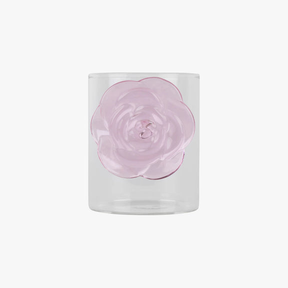 Elegant drinkglas van helder glas met een chic roze roosje dat elke drank een speelse en verfijnde uitstraling geeft. Geschikt voor warme en koude dranken zoals koffie, thee of cocktails.