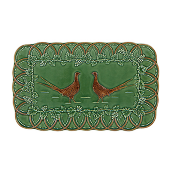 Laat de elegantie van de natuur spreken met het Woods Dienblad met Fazanten. Dit stijlvolle aardewerken dienblad in een zachte groene tint is versierd met een subtiel reliëf van fazanten. Ideaal voor het serveren van hapjes of als decoratief accent op tafel of dressoir. Een verfijnde toevoeging aan elke woonruimte.